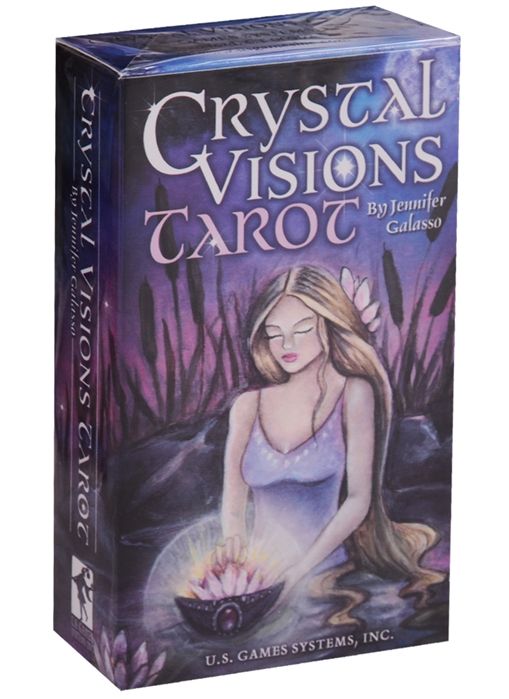 Crystal Visions Tarot — восхитительное, эмоциональное и романтичное Таро в стиле фэнтези. Работать с Crystal Visions Tarot сможет даже начинающий таролог — символика мастей может толковаться по книгам, посвященным колоде Уэйта. Колода не перегружена символикой. Каждая масть выполнена в своей цветовой гамме: Чаши — в фиолетовой, Мечи — в индиго и лавандовой, Пентакли — в коричневой и зеленой, а Жезлы — в розово-бежевой и оранжево-красной. Помимо этого, на Младших Арканах вы найдете символы основных стихий. Так, на Чашах — Луна в разных фазах, на Мечах — бабочки и птицы, на Пентаклях — растения и деревья, а на Жезлах — драконы и львы. В колоде есть дополнительная карта — Неизвестность. В инструкции описаны значения карт и в прямом, и в перевернутом положении. Картон плотный, глянцевый, рубашка симметричная.