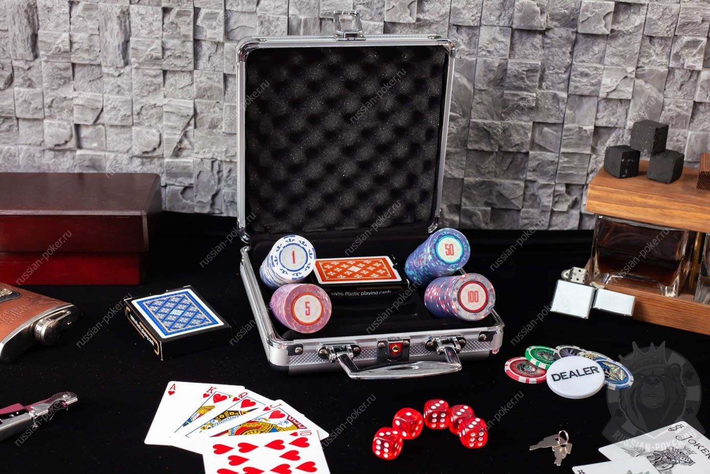 Набор покера Royal Flush на 100 фишек с номиналом, в стальном кейсе с пластиковыми картами