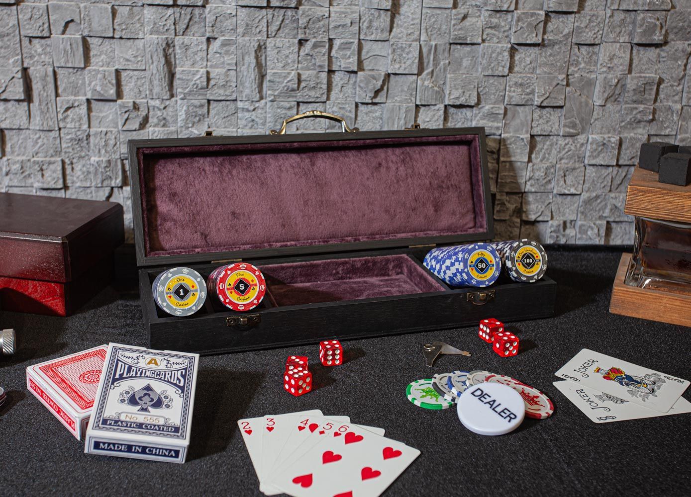Набор покера Dice на 100 фишек в черном деревянном кейсе с пластиковыми картами