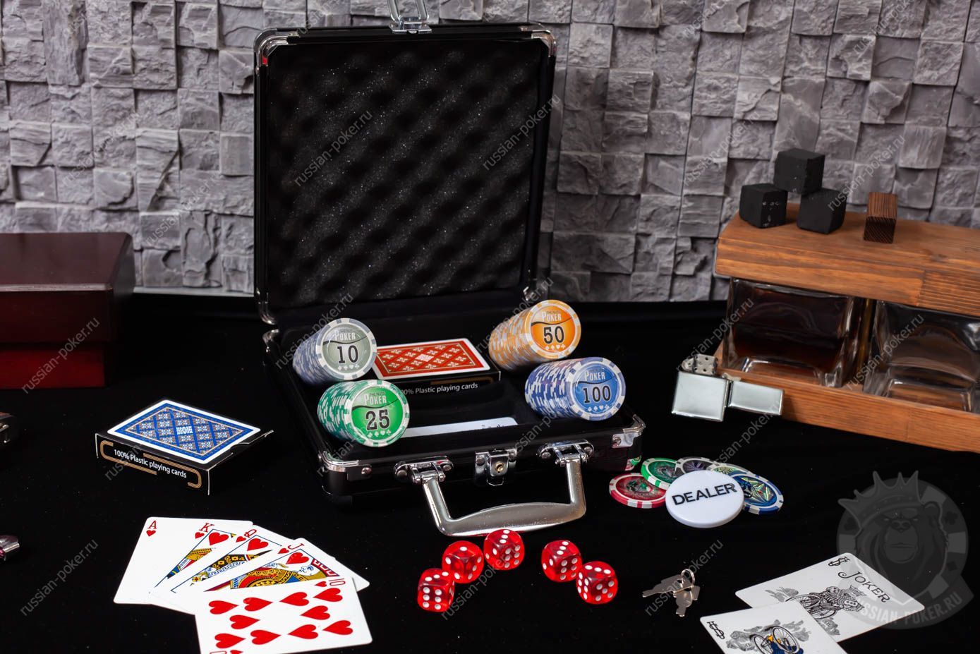Набор покера Royal Flush на 100 фишек с номиналом, в черном деревянном кейсе с пластиковыми картами