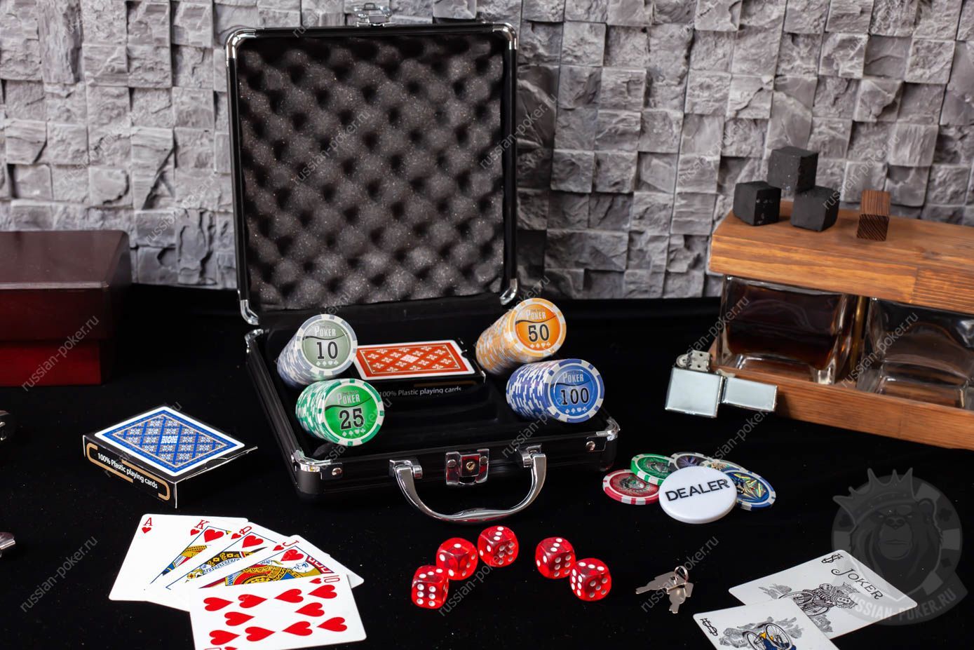 Набор покера Casino Royale на 100 фишек с номиналом, в кейсе с кожаными вставками с пластиковыми картами