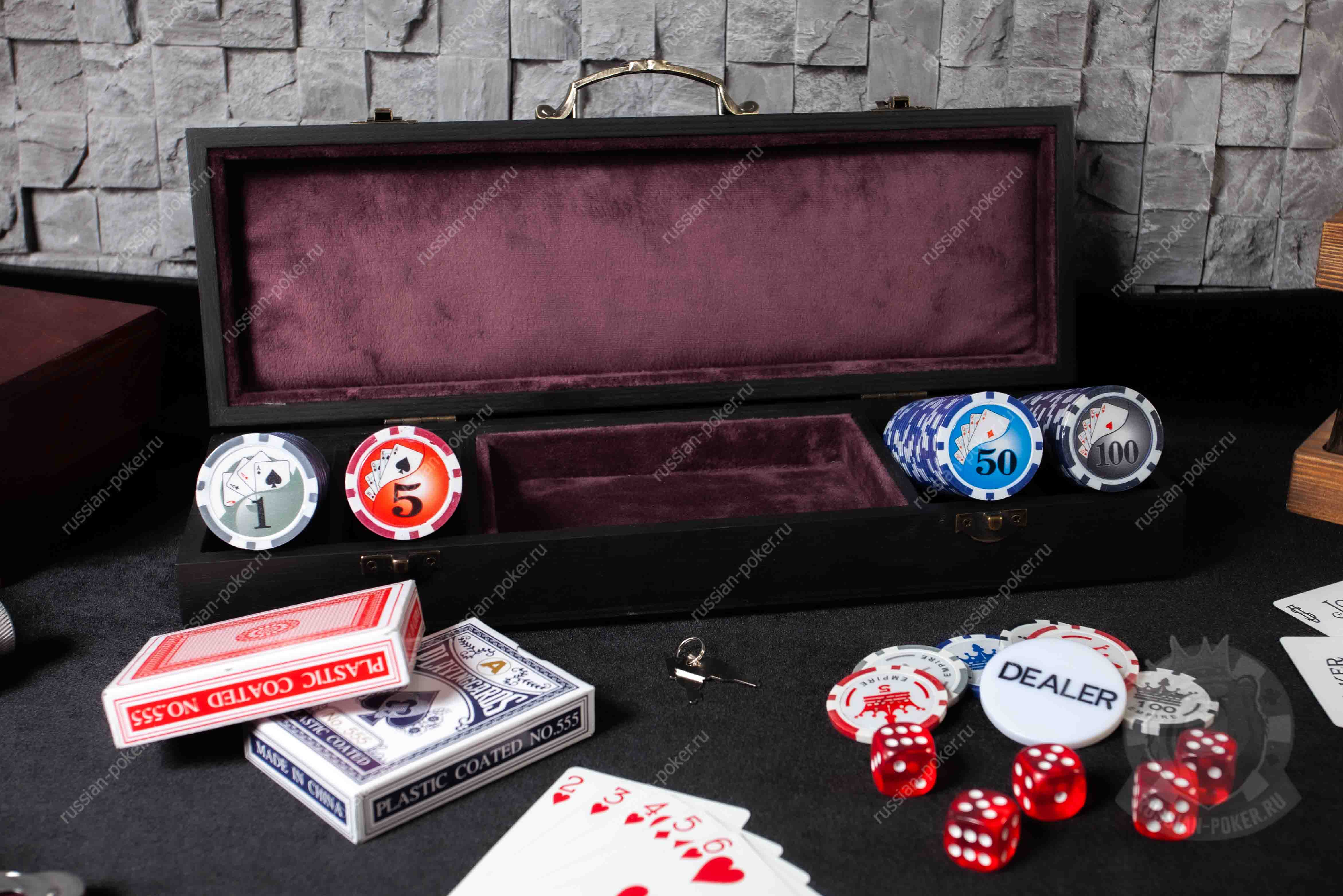 Набор покера Royal Flush на 100 фишек с номиналом, в черном деревянном кейсе