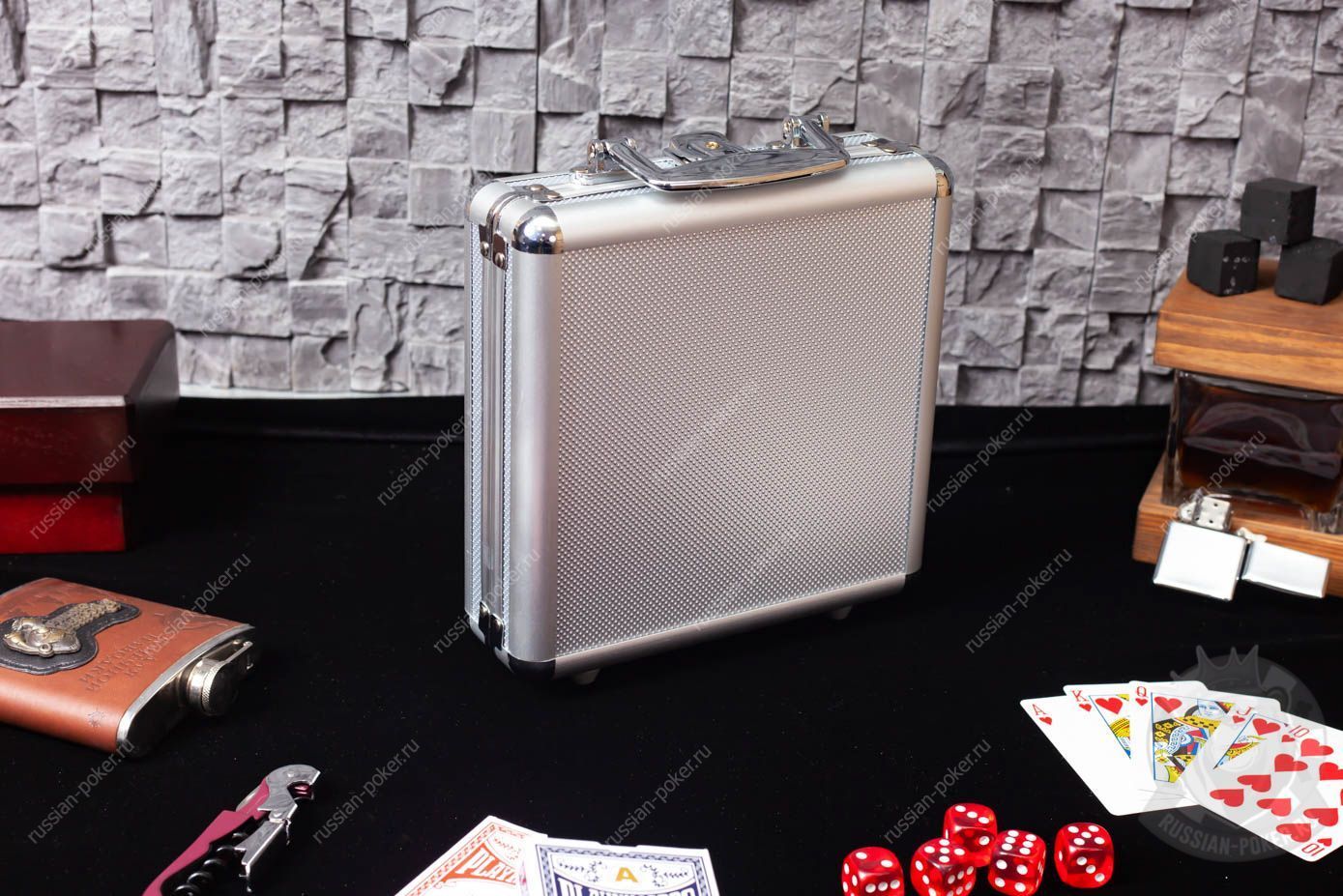 Набор покера RussianPro на 100 фишек с номиналом, в стальном кейсе с пластиковыми картами