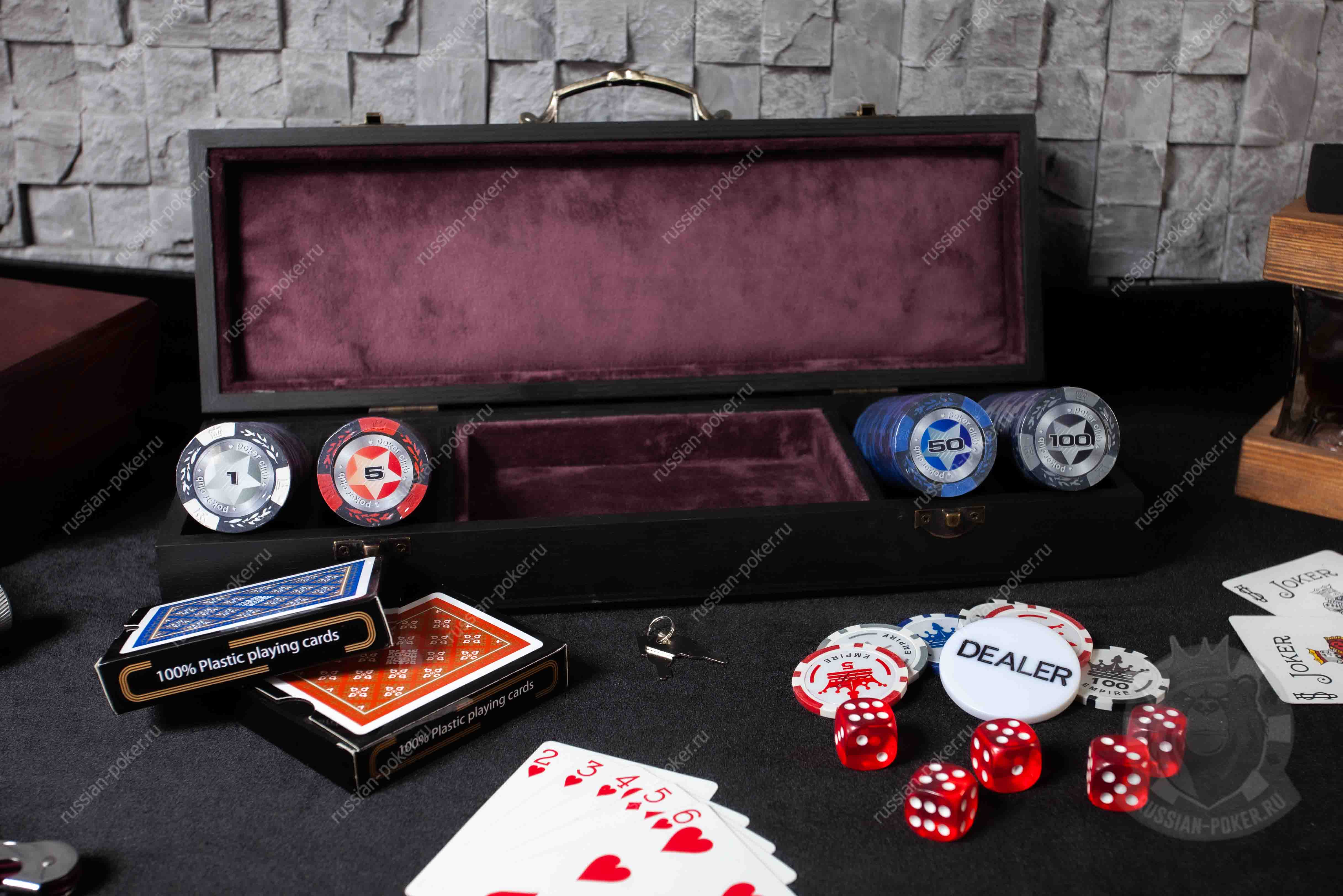 Набор покера Dice на 100 фишек в черном деревянном кейсе с пластиковыми картами