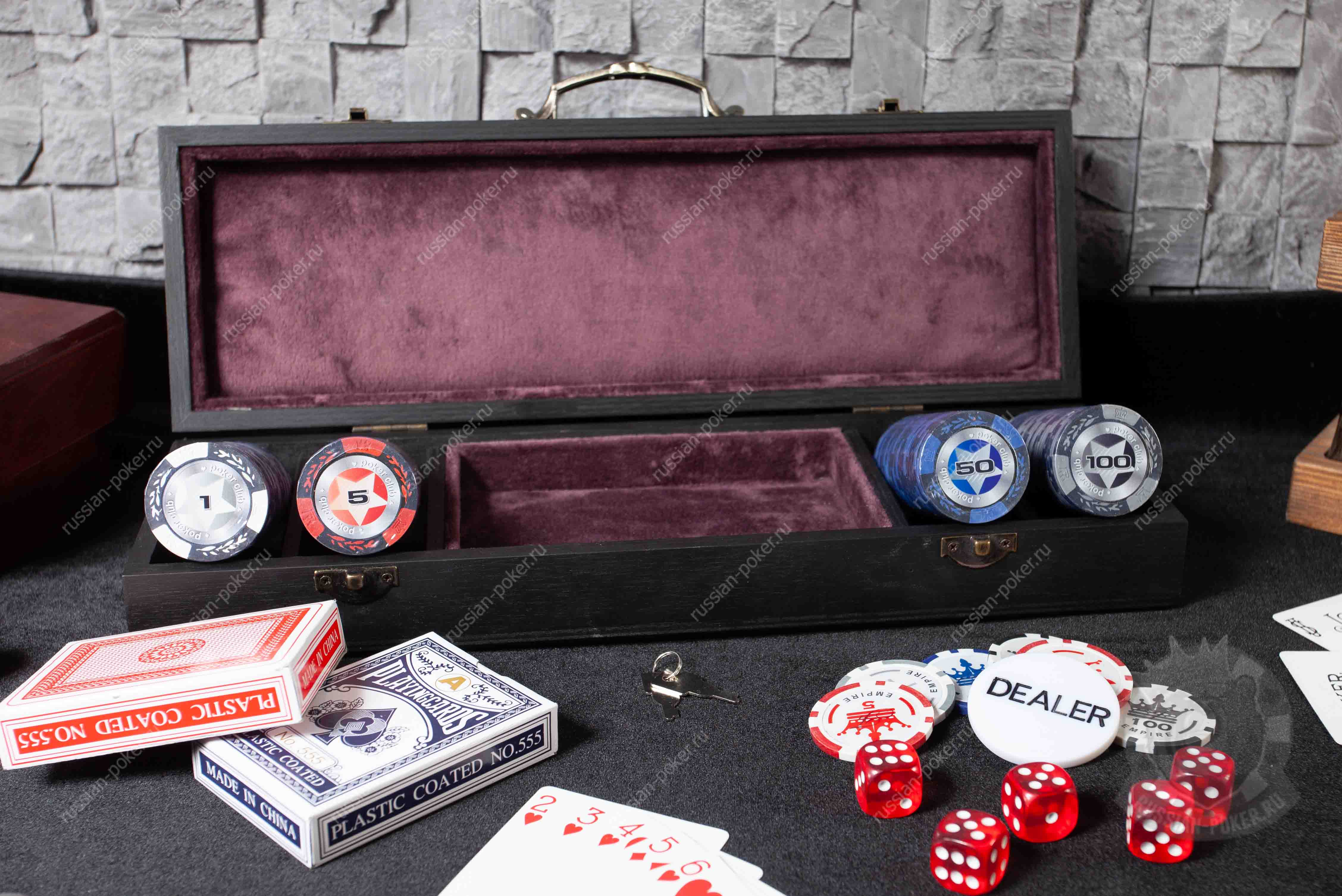 Набор покера Dice на 100 фишек в черном деревянном кейсе с пластиковыми картами