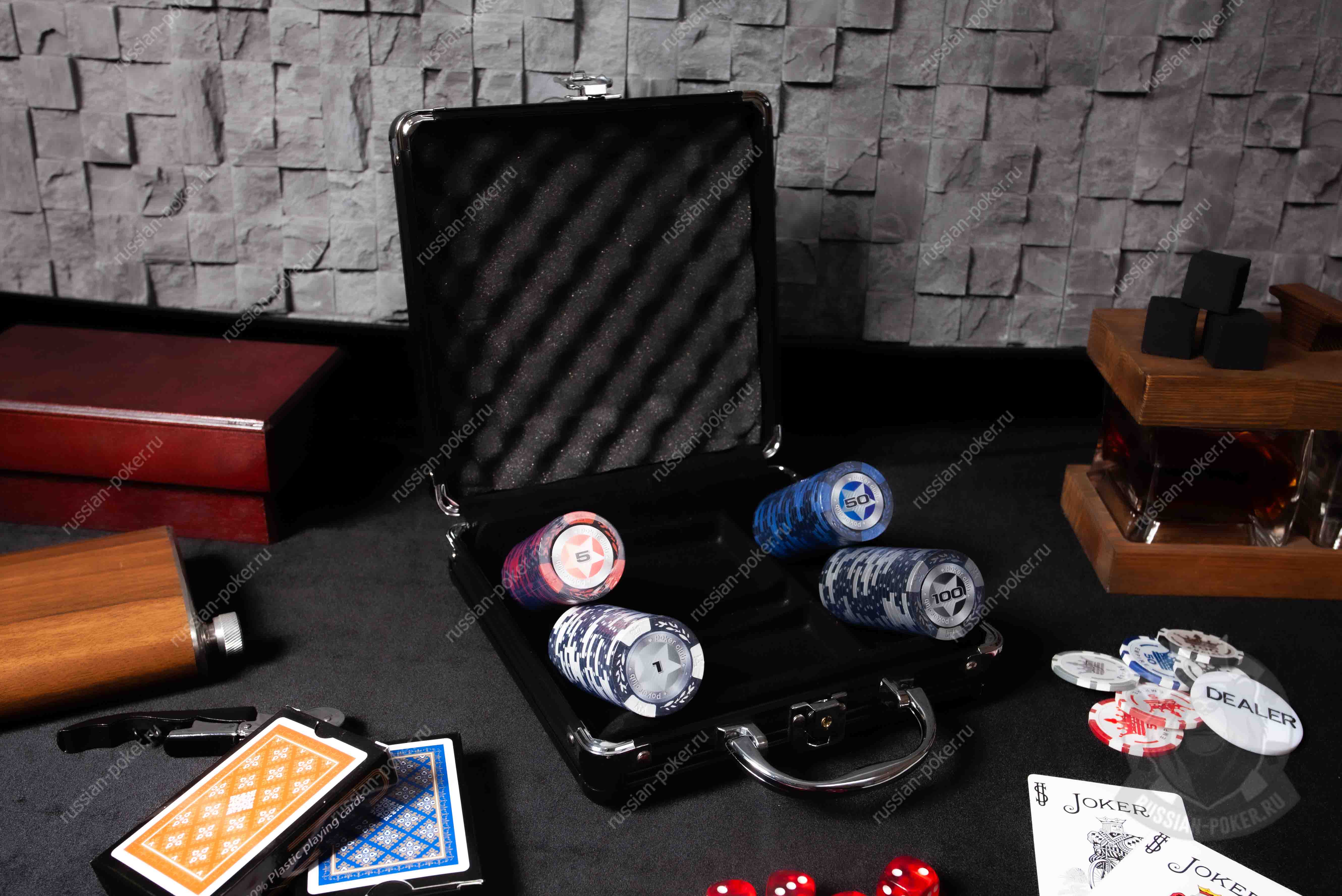 Набор покера Stars ULTRA на 100 фишек с номиналом, в черном кейсе с пластиковыми картами