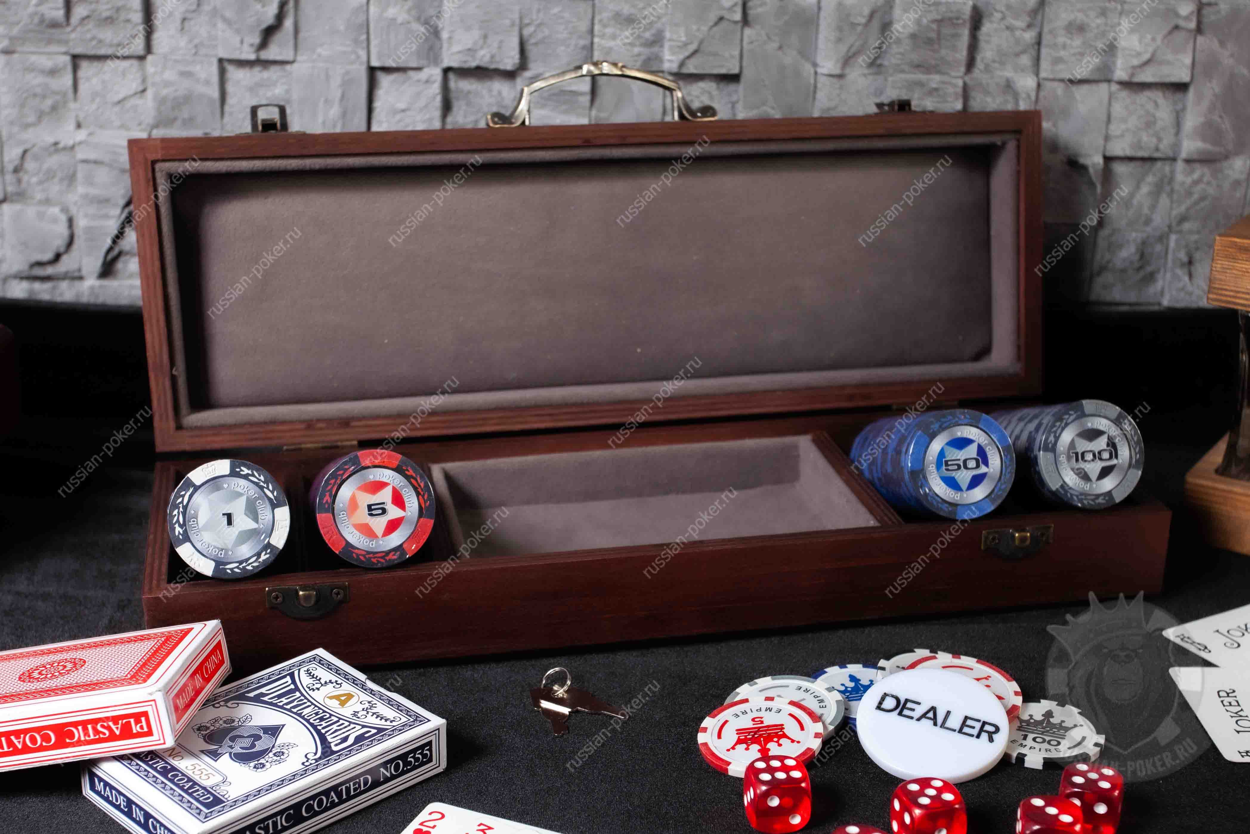 Набор покера Empire на 100 фишек с номиналом, в красном деревянном кейсе с пластиковыми картами