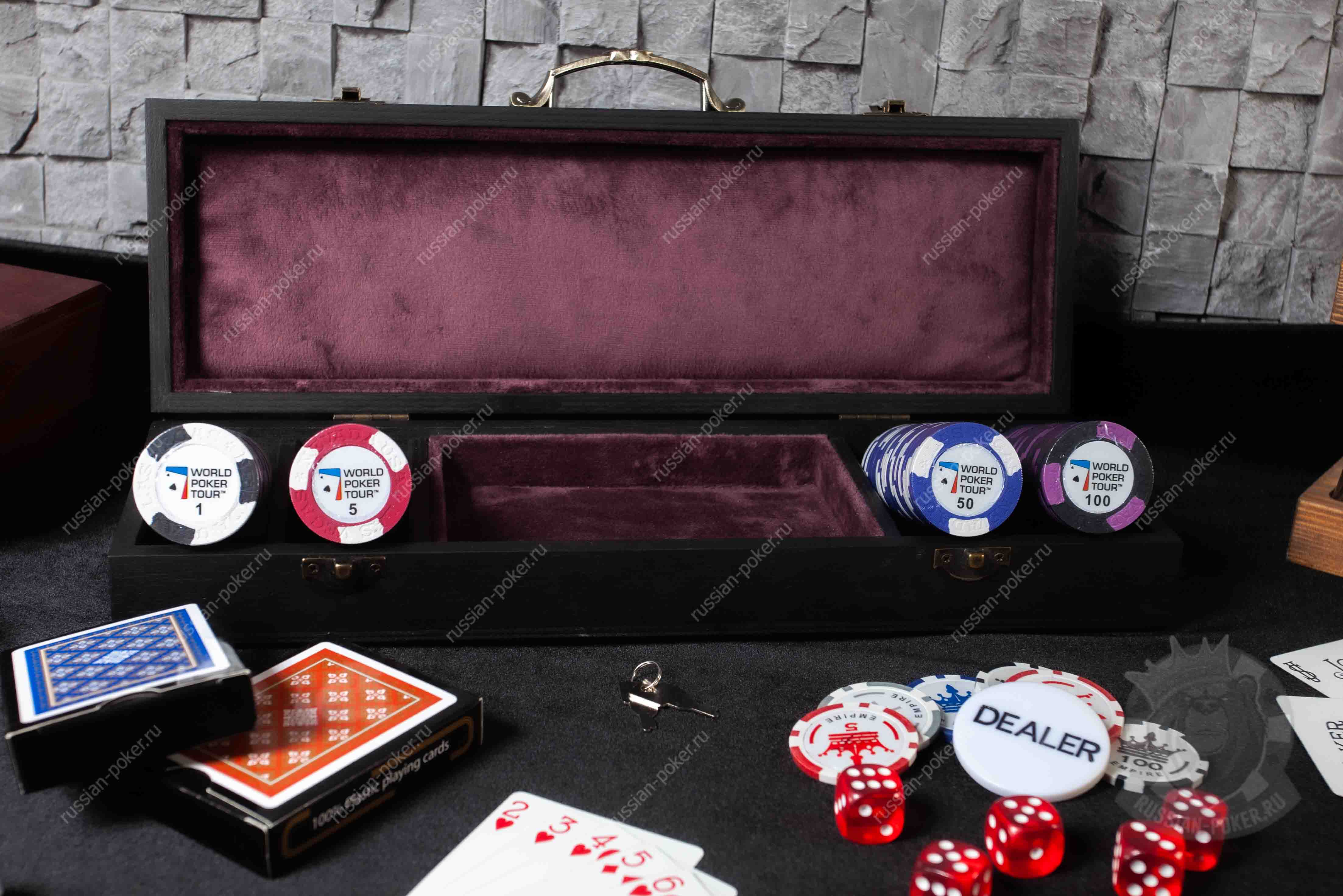 Набор покера WPT на 100 фишек с номиналом, в черном деревянном кейсе с пластиковыми картами