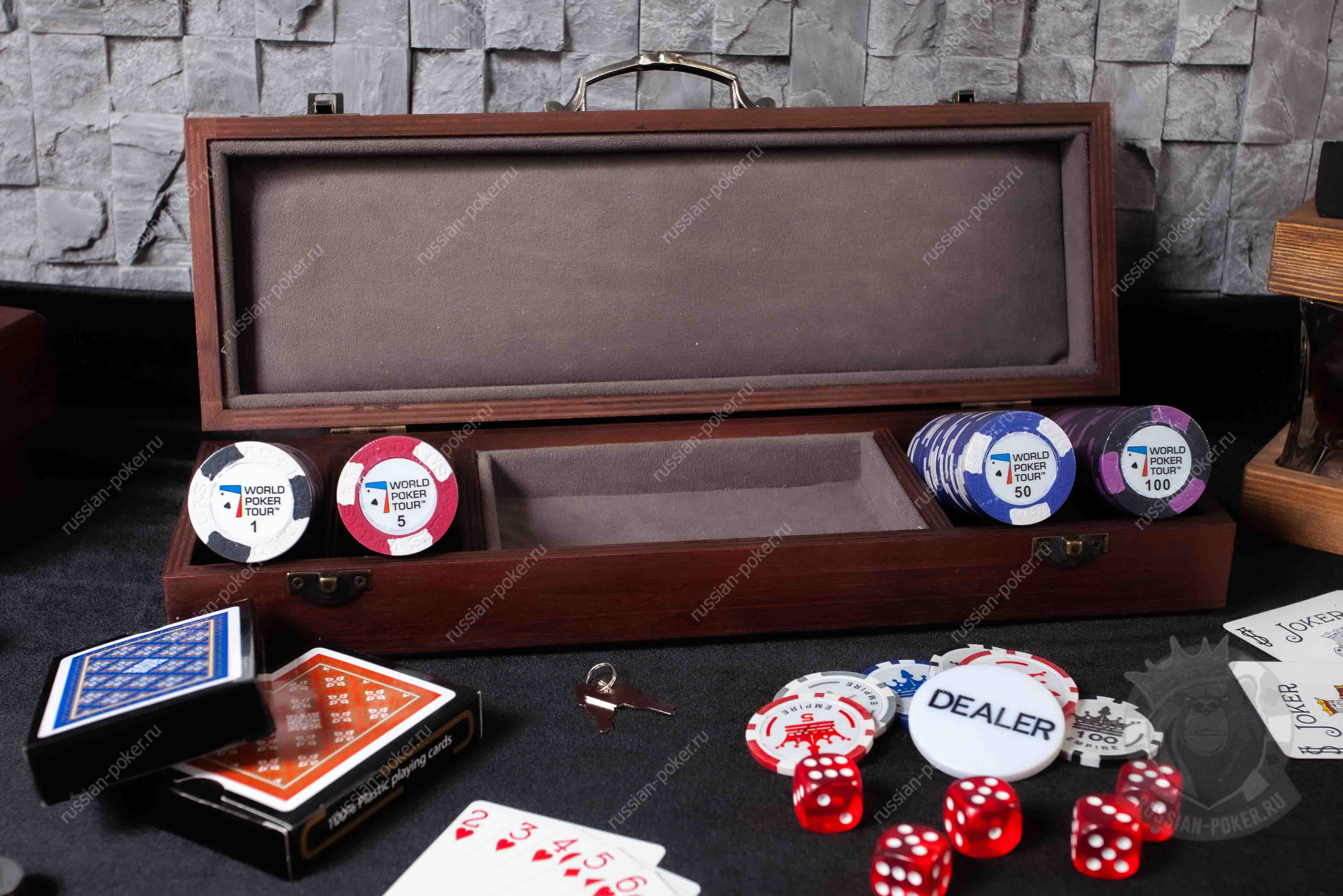 Набор покера WPT на 100 фишек с номиналом, в красном деревянном кейсе с пластиковыми картами