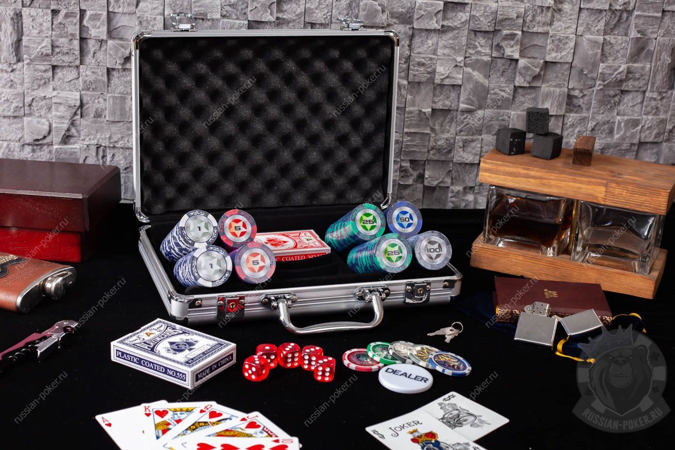 Набор покера Crown на 200 фишек с номиналом, в черном кейсе с пластиковыми картами