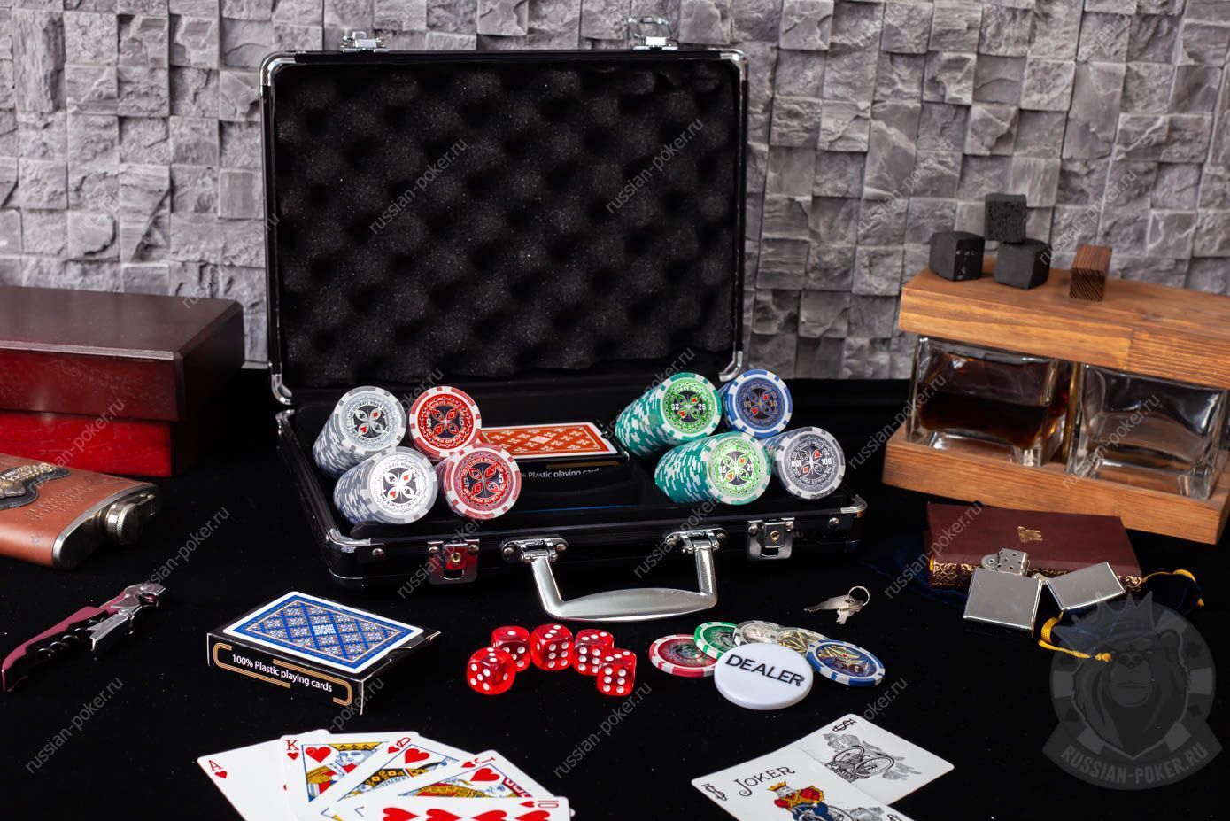 Набор покера Crown на 200 фишек с номиналом, в черном кейсе с пластиковыми картами