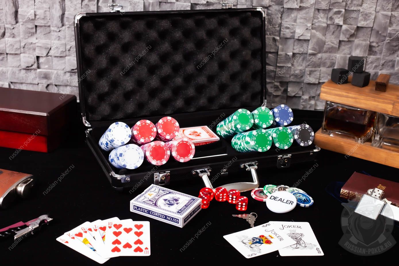 Набор покера VIP на 300 фишек с номиналом, в черном деревянном кейсе с пластиковыми картами