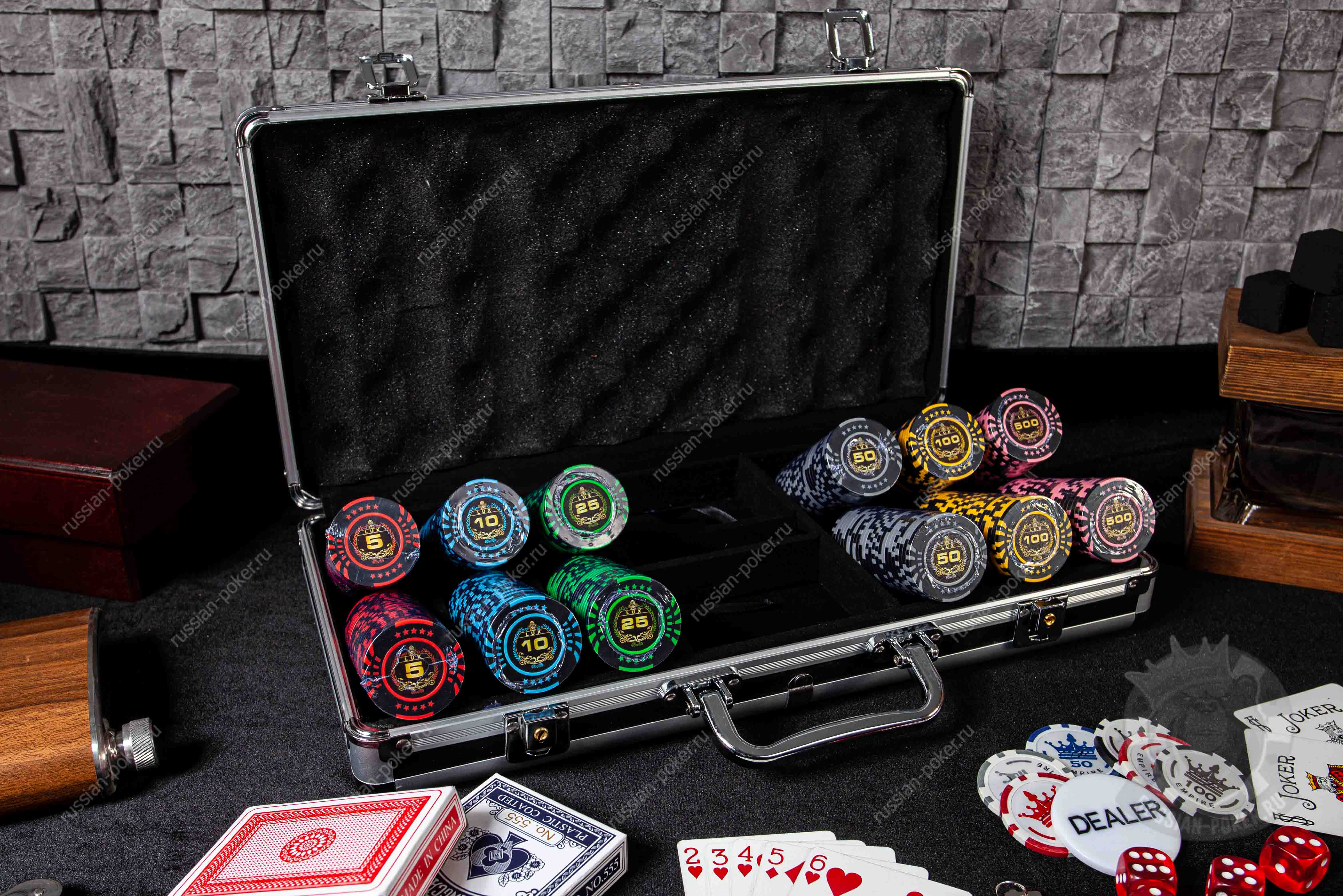 Набор покера RussianPro на 300 фишек с номиналом, в стальном кейсе с пластиковыми картами
