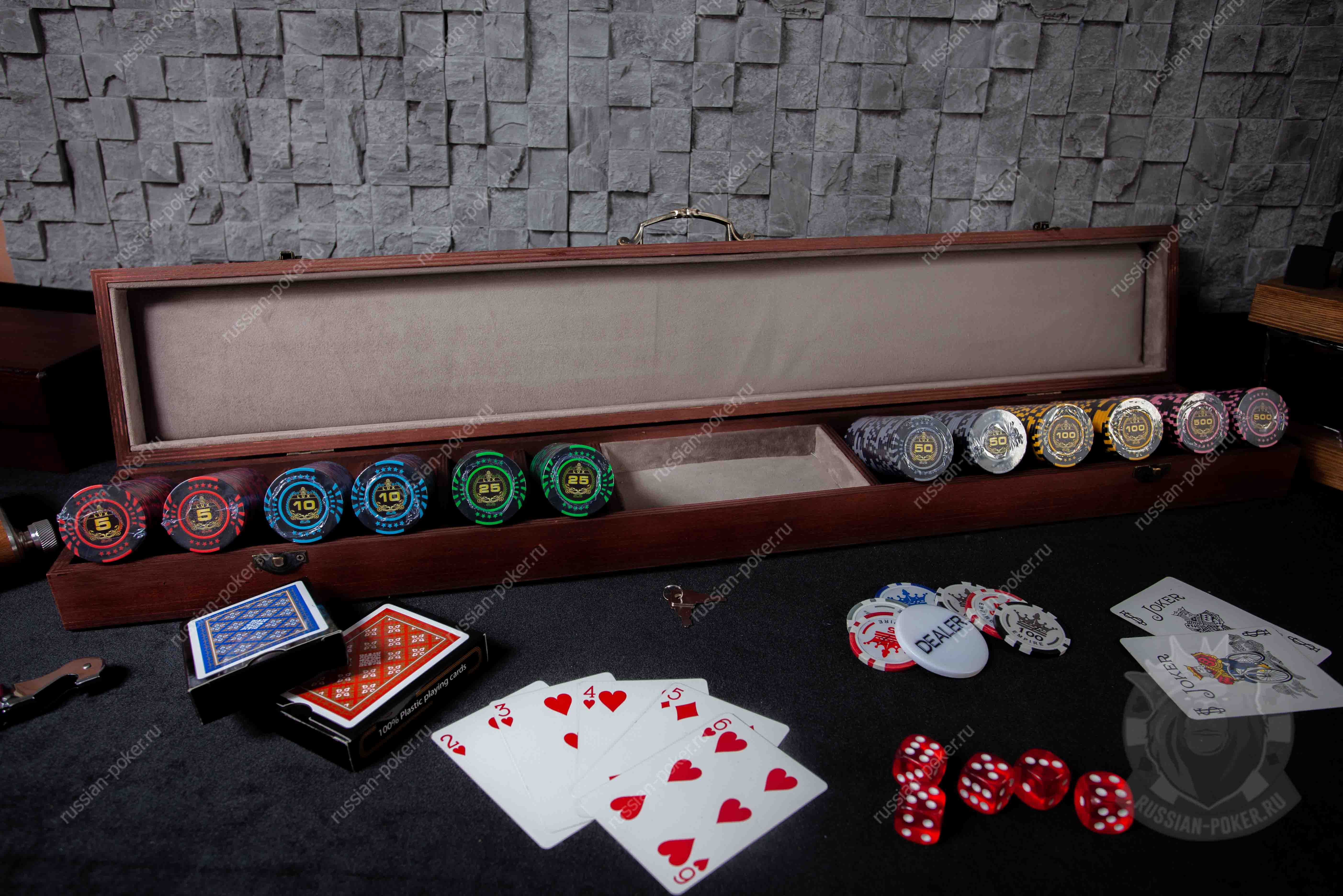Набор покера Casino Royale на 300 фишек с номиналом, в черном деревянном кейсе с пластиковыми картами