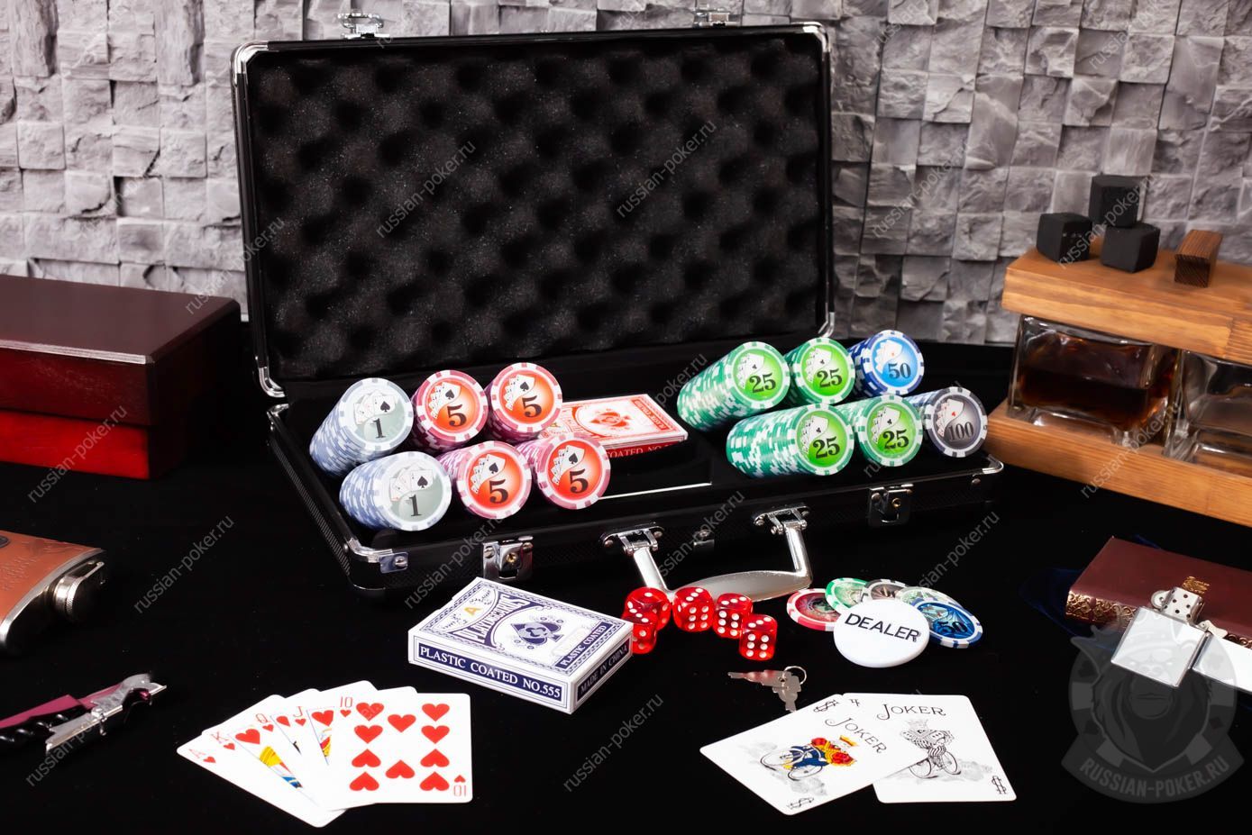 Набор покера RussianPro на 300 фишек с номиналом, в стальном кейсе с пластиковыми картами