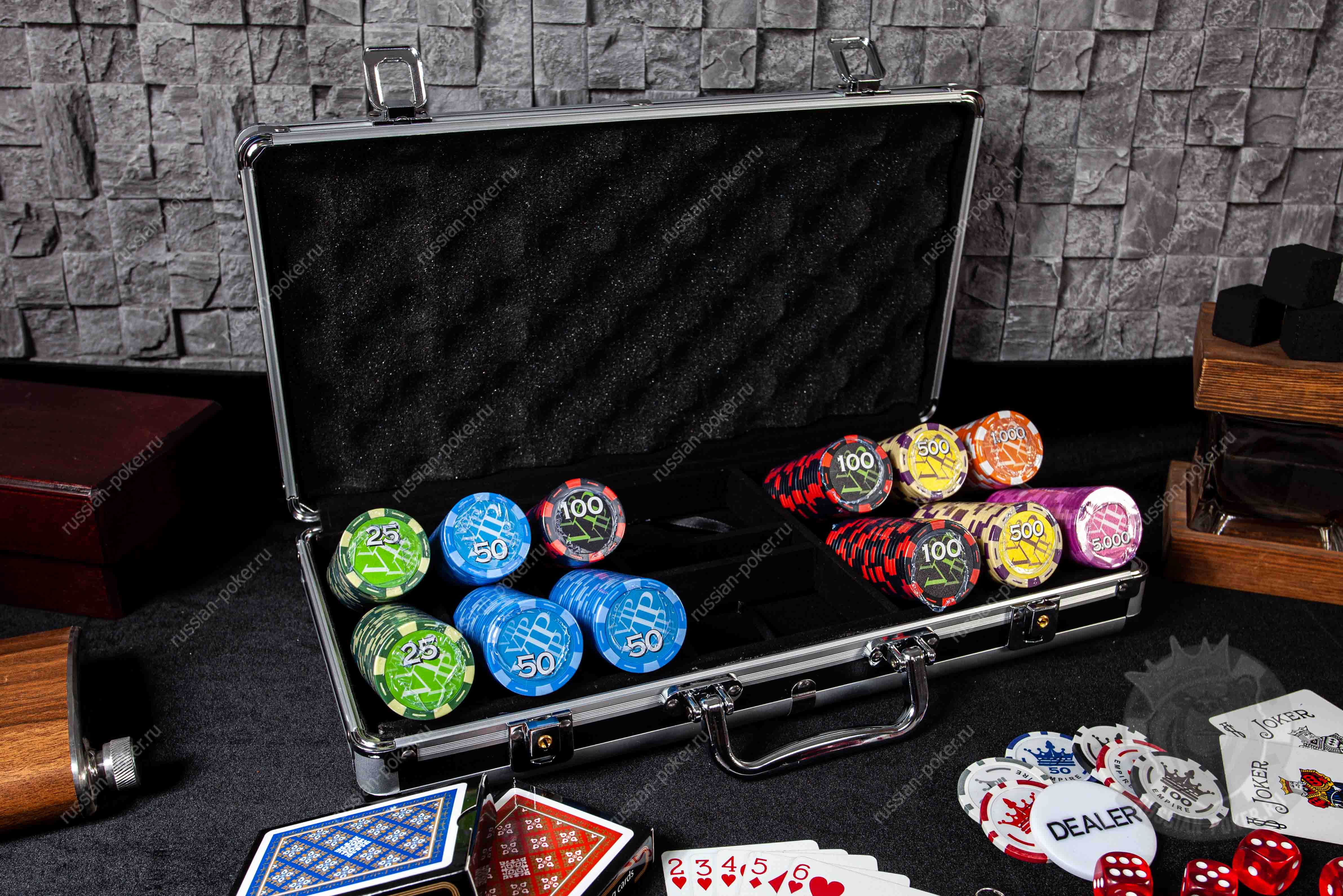 Набор покера RussianPro на 300 фишек с номиналом, в красном деревянном кейсе