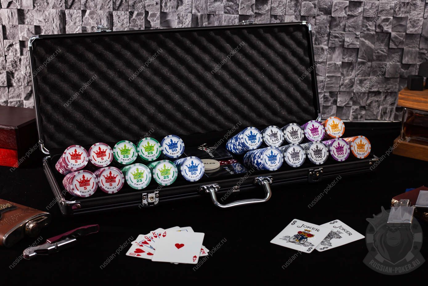 Набор покера Empire на 500 фишек с номиналом, в кейсе с кожаными вставками с пластиковыми картами