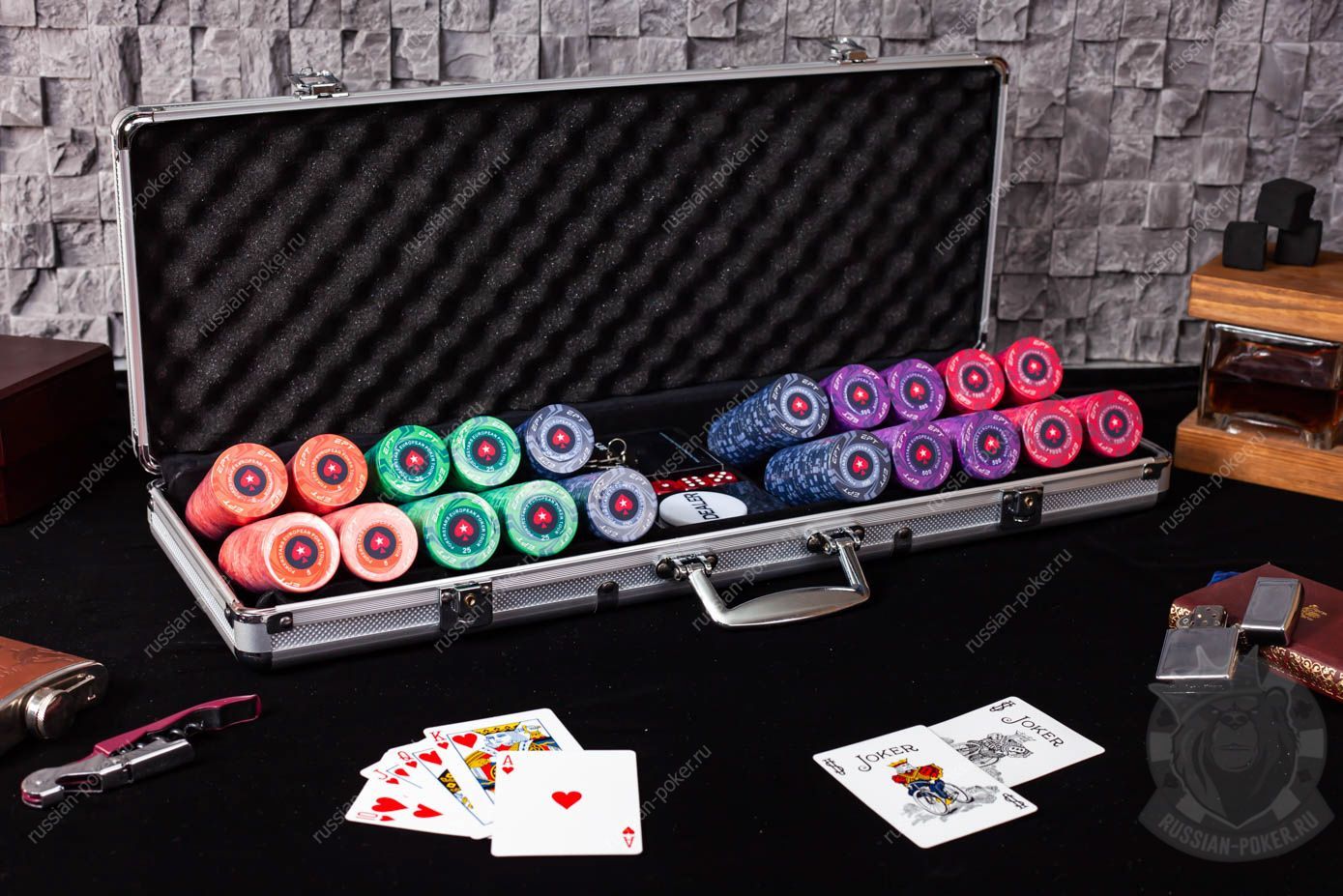 Набор покера RussianPro на 500 фишек с номиналом, в черном деревянном кейсе с пластиковыми картами