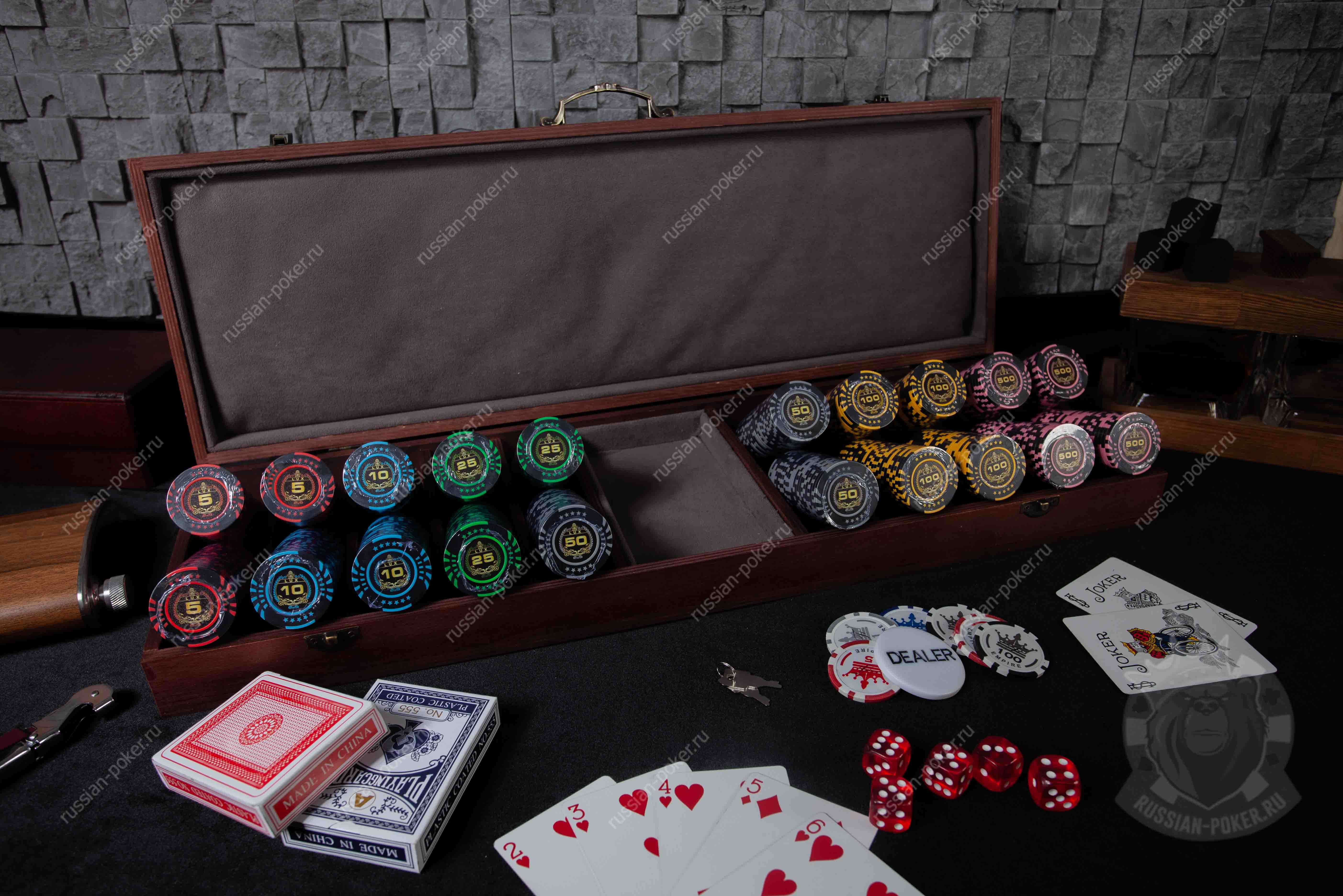 Набор покера LUX на 500 фишек с номиналом, в красном деревянном кейсе