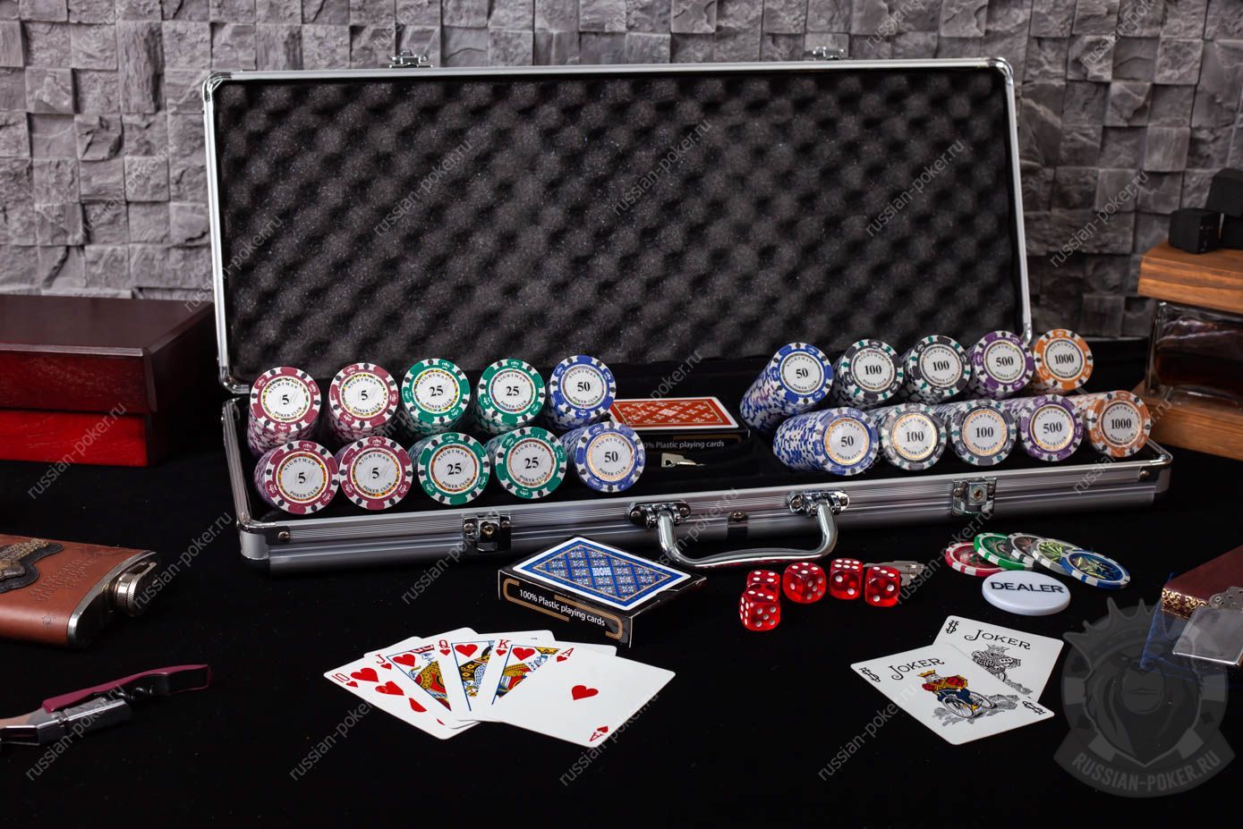 Набор покера RussianPro на 500 фишек с номиналом, в красном деревянном кейсе с пластиковыми картами