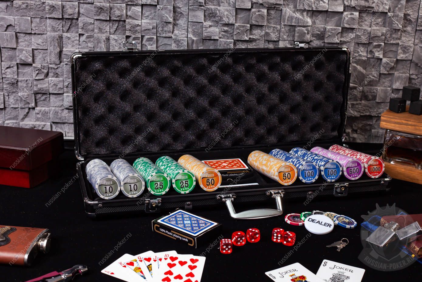 Набор покера Royal Flush на 500 фишек с номиналом, в черном деревянном кейсе