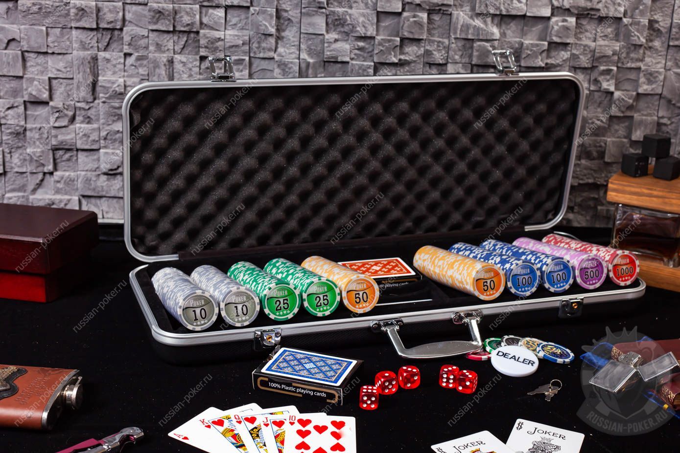 Набор покера RussianPro на 500 фишек с номиналом, в стальном кейсе