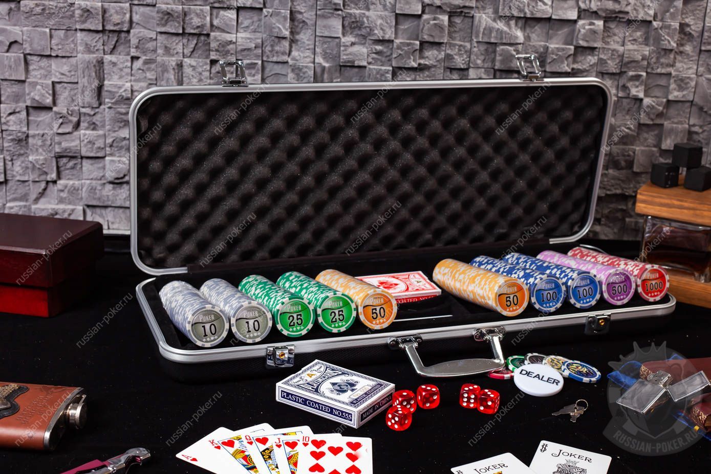 Набор покера RussianPro на 500 фишек с номиналом, в черном деревянном кейсе