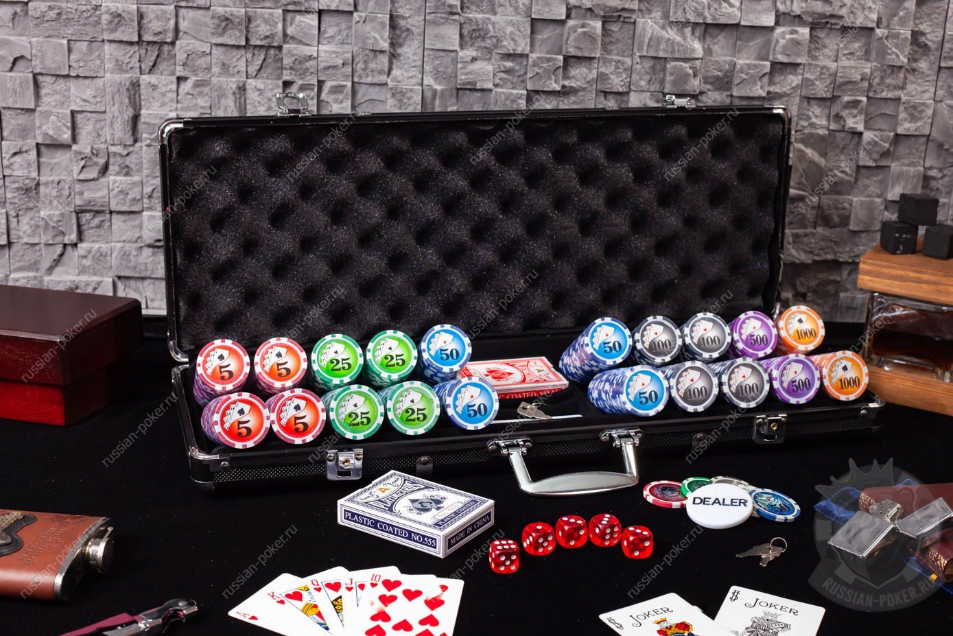 Набор покера RussianPro на 500 фишек с номиналом, в черном деревянном кейсе с пластиковыми картами
