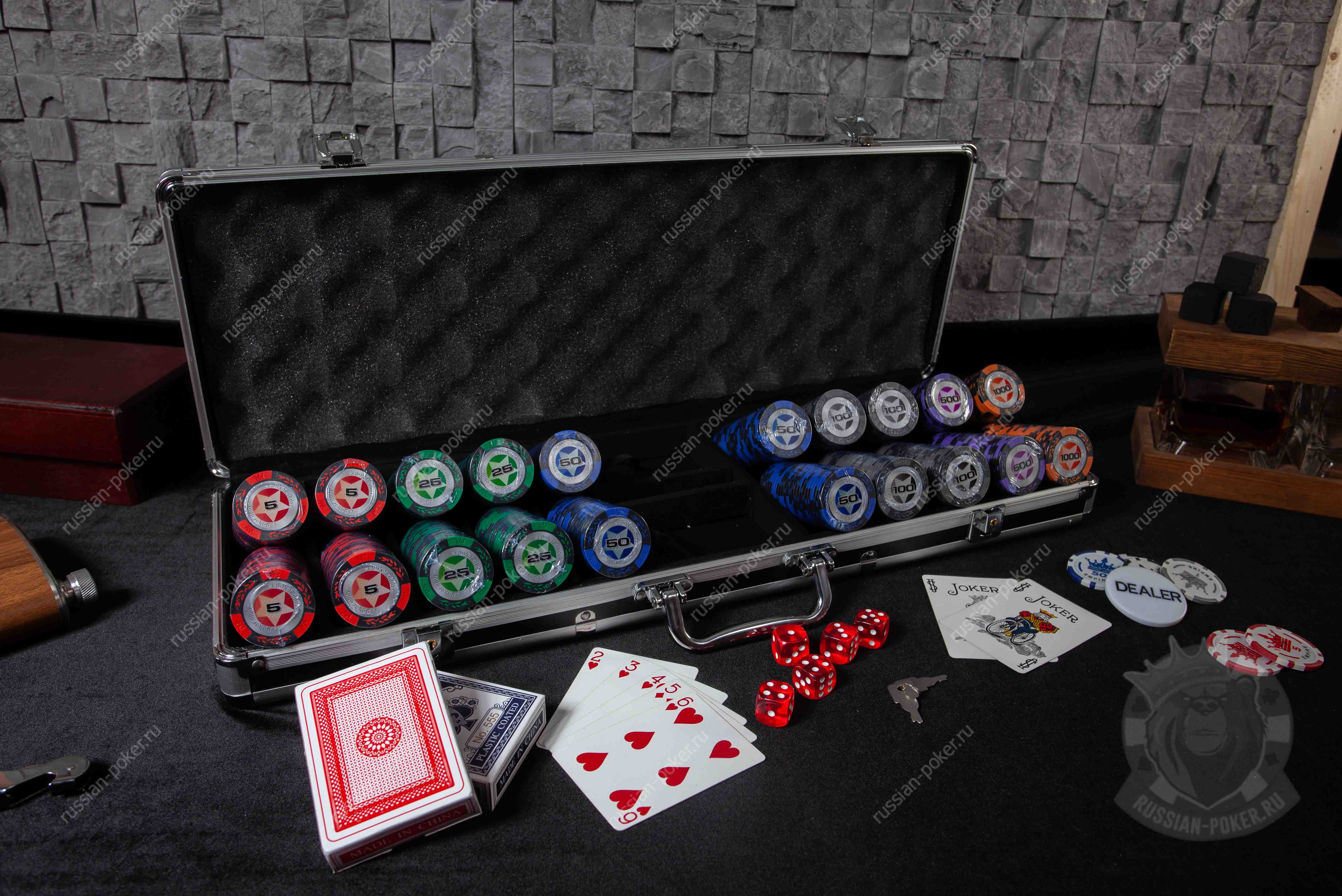 Набор покера Stars ULTRA на 500 фишек с номиналом, в фирменном кожаном кейсе с пластиковыми картами