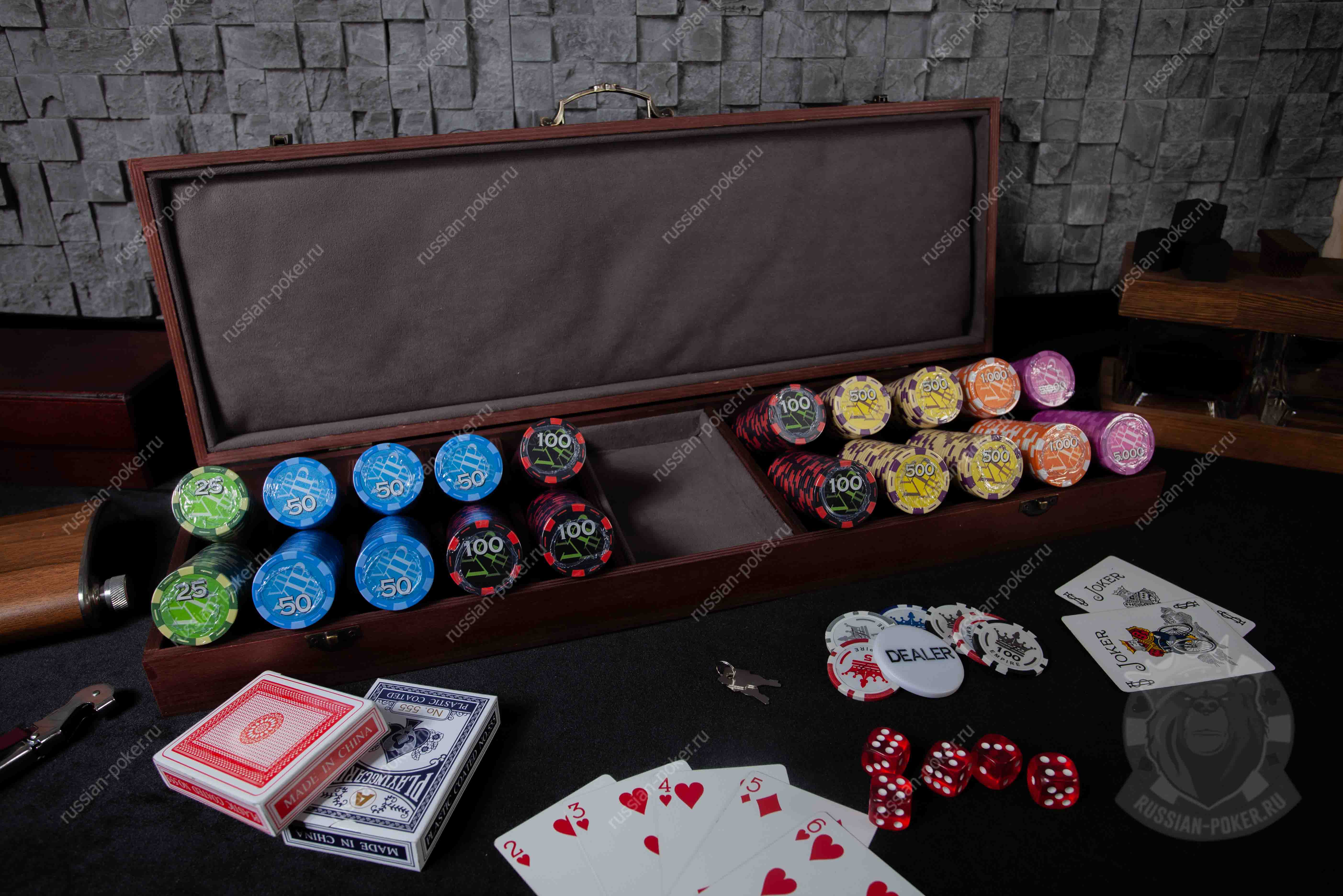 Набор покера RussianPro на 500 фишек с номиналом, в красном деревянном кейсе с пластиковыми картами
